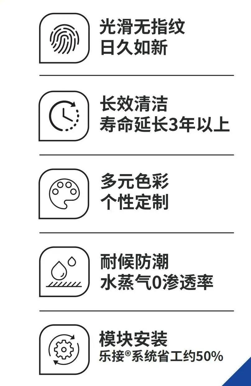 抗指紋系列鋁復(fù)合板表面具有防水防油防指紋附著,使表面光滑等功能的特殊涂料,相比于普通鋁復(fù)合板,表面更不易污染,可長(zhǎng)效保持板面清潔,降低清潔頻次,延長(zhǎng)使用壽命3年以上,具有
