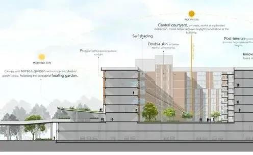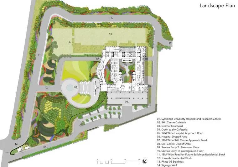 Symbiosis大學(xué)醫(yī)院和研究中心(SUHRC)占據(jù)Symbiosis國際大學(xué)在Lavale占地260英畝土地的山坡上,這是一家占地41,800平方米,擁有216張病床的多??漆t(yī)院,代表著一個嶄新的,進步的面貌印度的醫(yī)療保健基礎(chǔ)設(shè)施。憑借其最先進的醫(yī)療保健設(shè)施和增強技能開發(fā)的研究中心,它已牢固地立足成為COVID-19檢疫和治療設(shè)施,為馬哈拉施特拉邦抗擊疫情做出了貢獻。SUHRC的設(shè)計借鑒了親生物的思想(人類與生俱來的與自然和其他生命形式聯(lián)系的先天傾向),以促進患者和醫(yī)療保健專業(yè)人員的康復(fù)和復(fù)興。兩個開花的灌木叢和樹木環(huán)繞的大型庭院為室內(nèi)帶來充足的日光和室外景觀,同時創(chuàng)建緩沖區(qū)以減少交叉感染。諸如重癥監(jiān)護病房這樣的關(guān)鍵區(qū)域具有柔和的色調(diào),以減輕焦慮。OPD沒有空調(diào),但可以提供新鮮自然的空氣-從而減少了這些區(qū)域的氣流負(fù)載和功耗。從功能上講,該建筑包括四個部分。其中三個屬于醫(yī)院,最后一個是技能中心。醫(yī)院計劃分為五個級別;諸如OPD,傷亡,放射科,MHC等部門。