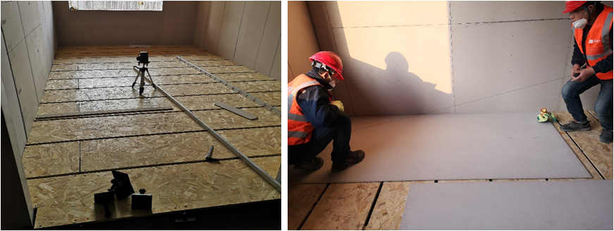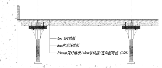 采用ABS高強(qiáng)支撐架空基層板,可采用20mm水泥纖維板、18mm玻鎂板、18mmOBS定向刨花板做基層調(diào)平,錯縫鋪貼8mm水泥纖維板及完成地面架空,面層可根據(jù)設(shè)計要求做各種材料的施工,施工效率高,架空高度可控5cm-25cm;