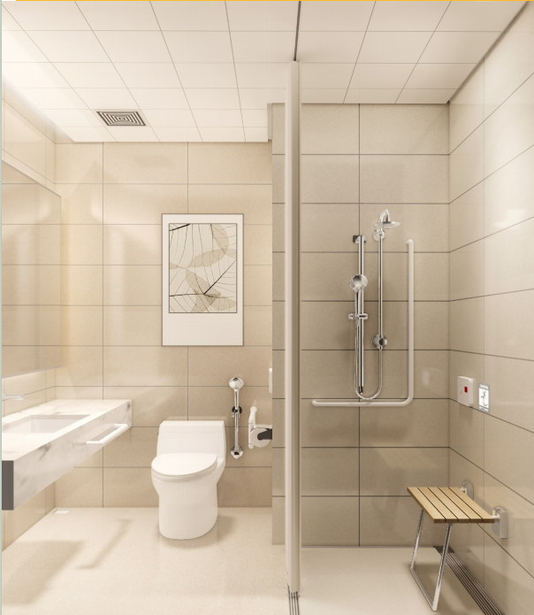 洗手間無障礙扶手、洗浴椅等建議使用PVC材料,也可采用防水復(fù)合板和不銹鋼支撐,為減少空間占用也可采用掛墻式洗浴椅,有的醫(yī)院在空間允許的條件下設(shè)置了砌體貼磚結(jié)構(gòu),但要注意施工防水作業(yè)。窗簾隔簾采用A級防火材料,嵌入式導(dǎo)軌為宜。