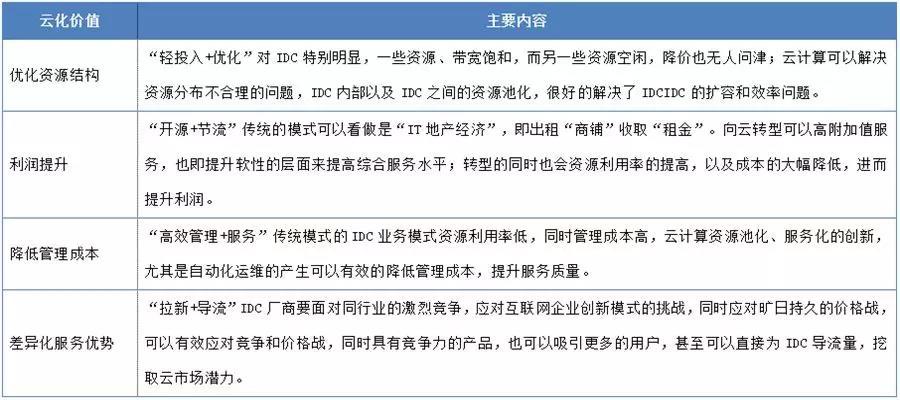 對(duì)于傳統(tǒng)IDC提供商來(lái)說(shuō),只提供基礎(chǔ)設(shè)施增值空間有限,同時(shí)也無(wú)法適應(yīng)逐漸復(fù)雜的云環(huán)境,同時(shí)云計(jì)算的發(fā)展也使得IDC面臨更加復(fù)雜的競(jìng)爭(zhēng)。云服務(wù)商的興起,使得IDC云化成為必然趨勢(shì),下圖是IDC云化的優(yōu)勢(shì):
