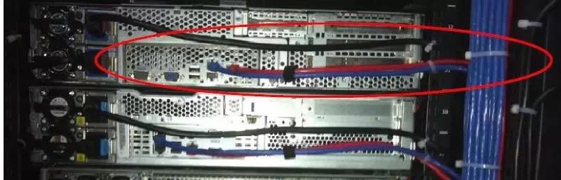 不同線纜用不同顏色的線區(qū)分,如內(nèi)網(wǎng)線:藍(lán)色,ILO線:灰色,電源線:黑色,預(yù)留的線纜長(zhǎng)度不宜過(guò)長(zhǎng),能從一側(cè)PDU到另外一側(cè)PDU即可,預(yù)留過(guò)長(zhǎng)線纜會(huì)對(duì)理線造成影響。上下兩臺(tái)服務(wù)器之間布線及捆綁要求如下圖:(因網(wǎng)線有電磁干擾,要做到強(qiáng)弱分開(kāi),電源線與網(wǎng)線要分開(kāi)捆扎)
