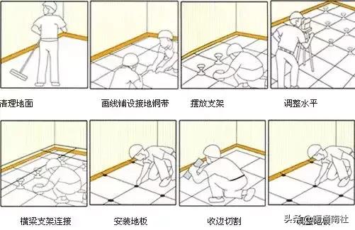 基層處理與清理->定位放線(xiàn)->粘貼導(dǎo)電銅帶->安裝固定可調(diào)支架和橫梁->鋪設(shè)活動(dòng)地板面層->防靜電接地->竣工清理